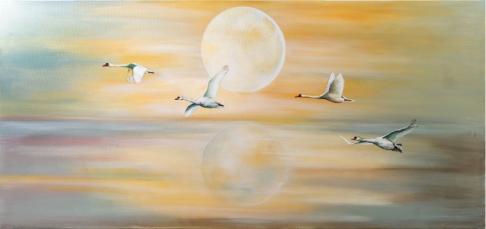 היצירה 'נוף עם ארבעה עגורים' מאת דיאנה שדה מעניקה לחללכם תחושה של רוגע ושלווה. בעזרת התנועה המלכותית של העגורים ותחושת האור הרך של הירח המשתקף במים, היצירה מזמינה אתכם לחוות את השקט והחופש שבטבע. הצבעים החמים והנעימים מעוררים תחושה של חום פנימי ומגע של קסם.