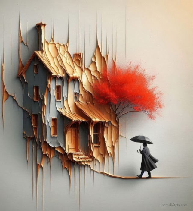 היצירה 'בית העץ האדום' מאת יובל אמיר, היא שילוב מופלא של ארכיטקטורה וטבע החוברים יחדיו לסיפור מרגש. הבית המתפרק והעץ האדום הבוהק יוצרים דיאלוג בין הקבוע למשתנה, בין הזמני לנצחי. הדמות הבודדה עם המטרייה מוסיפה נופך של מסתורין ועמקות, ומזמינה את הצופה להתבונן פנימה אל תוך עולמו הפנימי.