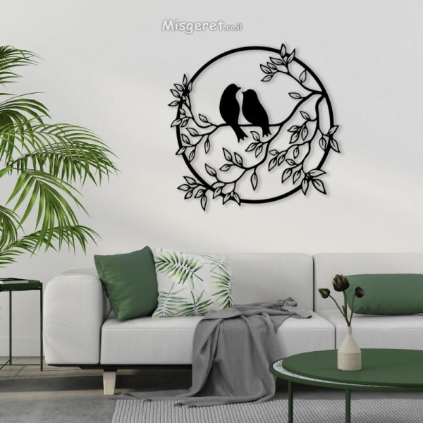 תמונת מתכת עגולה זוג ציפורים מאוהבים על ענף בעיצוב מודרני נורדי לסלון, לפינת אוכל, לבית, למטבח או למשרד.