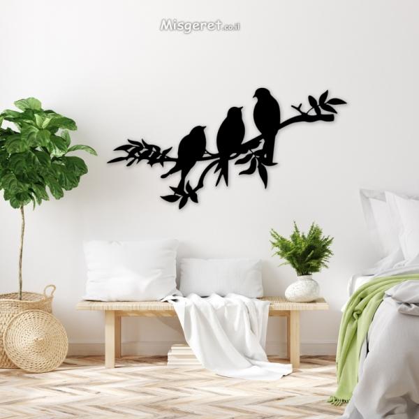 תמונת מתכת שלישיית ציפורים על ענף בעיצוב מודרני נורדי לסלון, לפינת אוכל, לבית, למטבח או למשרד.