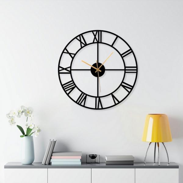 שעון קיר עגול ספרות רומי עדין ממתכת בעיצוב מודרני לסלון, לפינת אוכל, לבית, למטבח או למשרד.