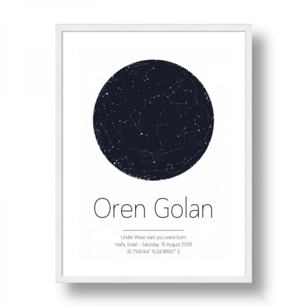 מפת כוכבים אישית מדהימה בעיצוב מודרני המציגה את תצורת הכוכבים האמיתית כפי שהיתה בדיוק בתאריך ובשעה המיוחדת שלכם!