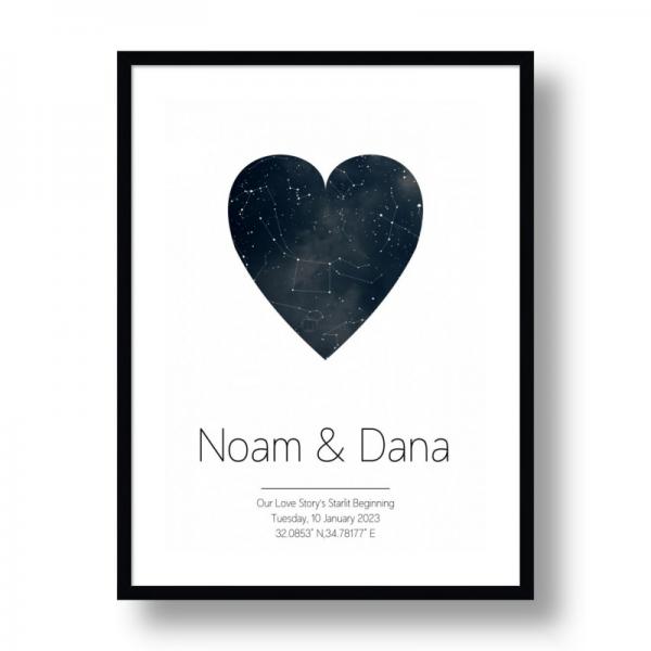 מפת כוכבים אישית מדהימה בעיצוב מודרני המציגה את תצורת הכוכבים האמיתית כפי שהיתה בדיוק בתאריך ובשעה המיוחדת שלכם!