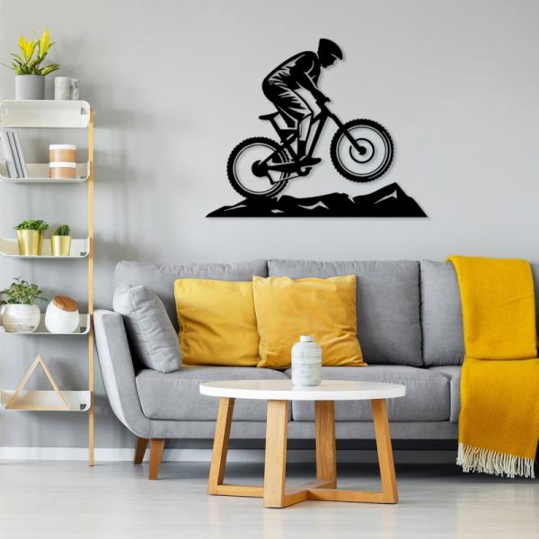 תמונת מתכת רוכב אופני הרים בעיצוב מודרני ומיוחד. מתאים לבית, לחדרי נוער או למשרד לכל חובב הג'אנר.
