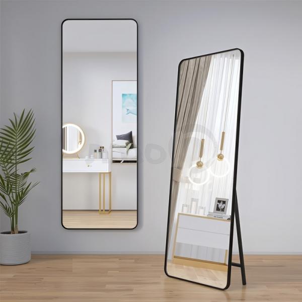 מראת גוף מלבנית עומדת או לתליה עם רגל אחורית בגודל 160/40 ס"מ. עשויה קריסטל יוקרתי עם מסגרת אלומיניום בצבע שחור. מודרנית ויפה, מראה נקי ואסתטי.