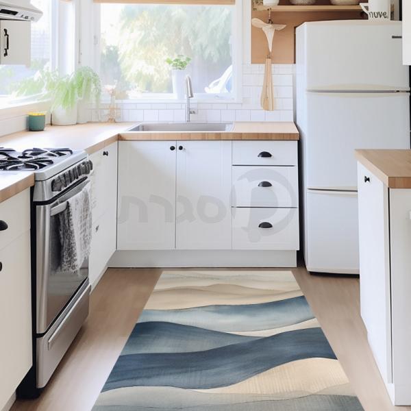 דגם זה בגווני כחול ובז' עם עיצוב גלים רכים יעניק למטבח שלך מראה שלו ונינוח. השטיחים שלנו מעוצבים במחשבה על נוחות ועמידות, ומתאימים לכל מי שמחפש לשלב עיצוב מרגיע עם פרקטיות.