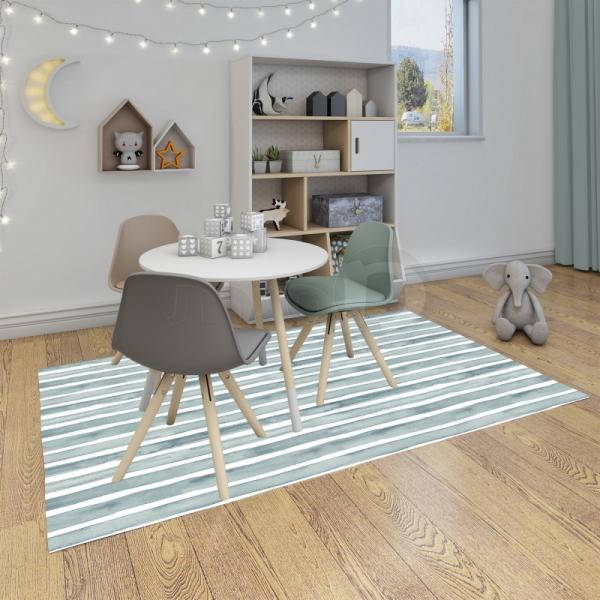 שטיח פי וי סי לחדר הילדים עם דוגמאות של פסים רכים בצבעי מים. השטיח עמיד, קל לניקוי ומוסיף אווירה רגועה ונעימה לחדר הילדים. מושלם ליצירת חלל משחקים מרגיע ונעים לילדים.
