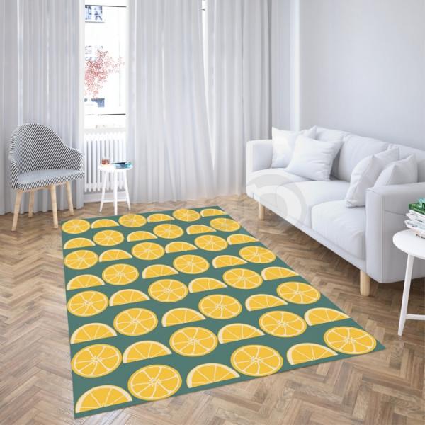 שטיח פי וי סי לסלון עם דוגמת לימונים פרוסים על רקע ירוק כהה. עיצוב רענן וקליל שמביא תחושת טבע וטריות לחלל המגורים. השטיח עמיד, קל לניקוי ומתאים למי שמחפש לשלב עיצוב כיפי ופרקטיות בביתו. מושלם להוספת נגיעה של צבע ושמחה לסלון שלך.