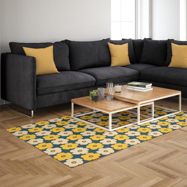 שטיח פי וי סי לסלון עם דוגמת פרחים צהובים ולבנים על רקע כהה. עיצוב הפרחים הצבעוני מוסיף חיים ושמחה לחלל הבית, ומשדרג את המראה של כל סלון. השטיח עמיד, קל לניקוי ומציע פתרון פרקטי ויפהפה לכל מי שמחפש להוסיף נגיעה של טבע ופרחים לביתו. מושלם למשפחות עם ילדים, חיות מחמד או סתם לאוהבי פרחים.