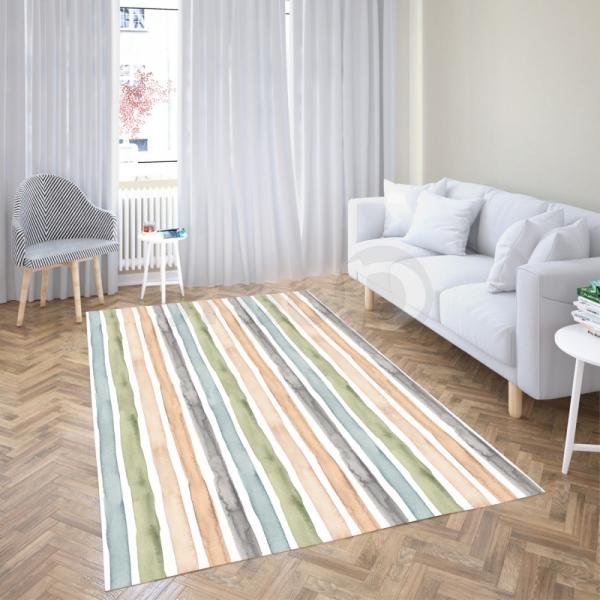 שטיח פי וי סי לסלון עם דוגמת פסים צבעוניים מרגיעה. הפסים בגווני כחול, ירוק, כתום ואפור מעניקים לחלל מראה טבעי ומרענן. השטיח עשוי מחומר עמיד וקל לניקוי, אידיאלי לסלון מודרני המחפש לשלב עיצוב פשוט ואלגנטי עם פרקטיות ונוחות.