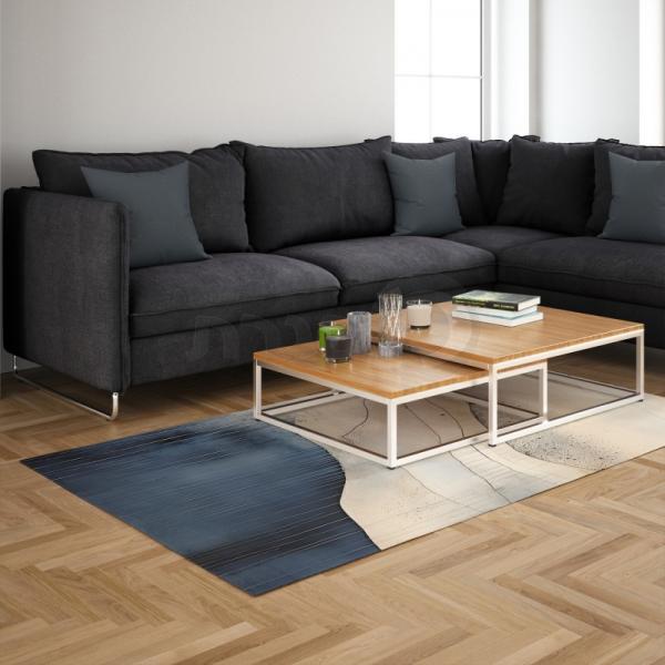 שטיח פי וי סי לסלון בדוגמת קווים עדינים בגווני כחול ובז'