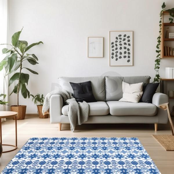 שטיח פי וי סי לסלון עם דוגמת אתנו בגווני כחול ולבן. השטיח משלב דפוסים אתניים מסורתיים המעניקים לחלל אווירה ייחודית ומיוחדת. קל לניקוי, עמיד בפני כתמים ומים, ומתאים לכל מי שמחפש לשלב עיצוב תרבותי עם פרקטיות. אידיאלי להוספת מראה מרשים ומודרני לסלון הבית.