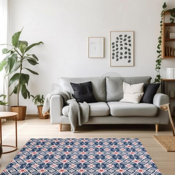 שטיח פי וי סי לסלון בעיצוב מרוקאי בגווני כחול ואדום