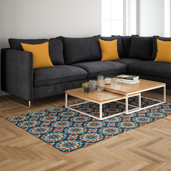 שטיח פי וי סי לסלון עם דוגמת פרחים מרהיבה בגווני כתום, כחול ואדום. השטיח משלב עיצוב עשיר וצבעוני, שמוסיף מגע של חיות ואמנות לכל חדר. עשוי מחומר עמיד וקל לניקוי, מושלם לשימוש יומיומי וקל לתחזוקה. מביא עיצוב ייחודי ואווירה חמה ונעימה לכל סלון.