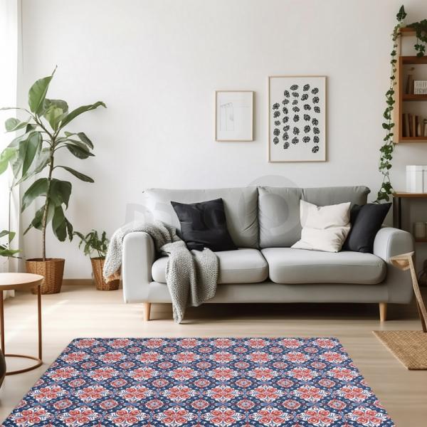 שטיח פי וי סי לסלון עם דוגמת פרחים קלאסית בגווני כחול, אדום ולבן. העיצוב האלגנטי והצבעים החזקים מעניקים לחלל הסלון תחושה של חמימות וסטייל. השטיח עשוי מחומר עמיד וקל לניקוי, מושלם לשימוש יומיומי ומוסיף חן ויוקרה לכל חדר. השטיח מביא תחושת רעננות ואווירה ביתית לסלון שלכם.
