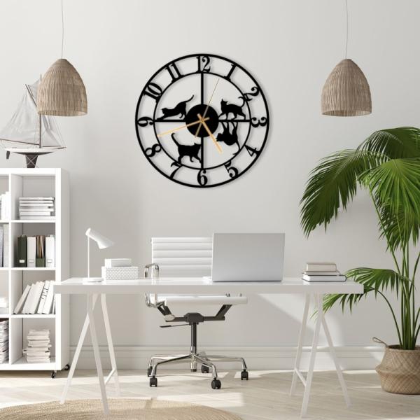 שעון קיר עגול חתולים ממתכת בעיצוב מודרני לסלון, לפינת אוכל, לבית, למטבח או למשרד.