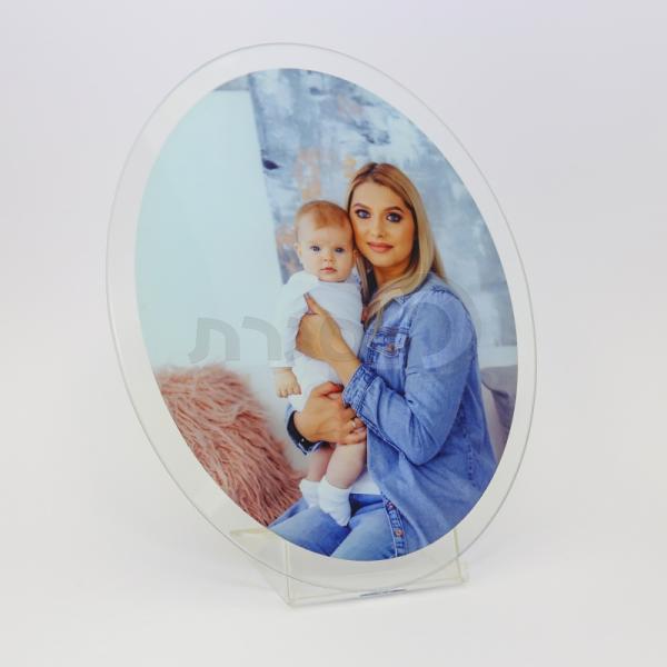 זכוכית דקה בגודל 24/22 ס"מ, בחיתוך אליפסה אלגנטי ומעוצב, עם מעמד תואם להצגת התמונה בצורה יציבה ומכובדת. ההדפסה האיכותית על גבי הזכוכית מדגישה את הצבעים והפרטים הקטנים, ומעניקה לכל תמונה עומק יוקרתי וברק מרהיב.